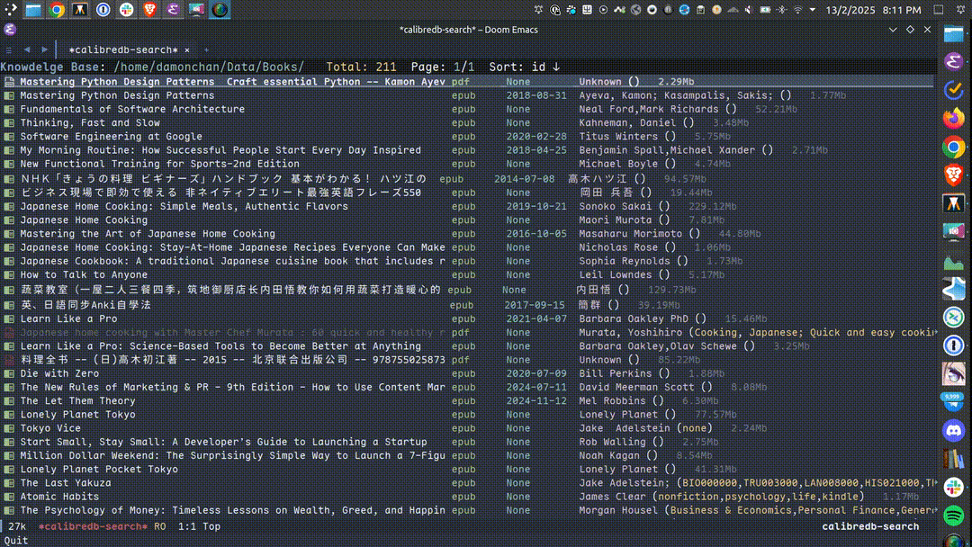 Therefore, by parsing .metadata.calibre, we can manage all documents inside one flat folder using calibredb.el - The documents management software inside Emacs. What amazing thing is that, after generating the folder meatadata, calibredb.el can smartly filter metadata with live filter feature without using calibre or other calibre command lines, making it also be able to manage ebooks inside Android Emacs where it is unable to install calibre on Termux at this moment.