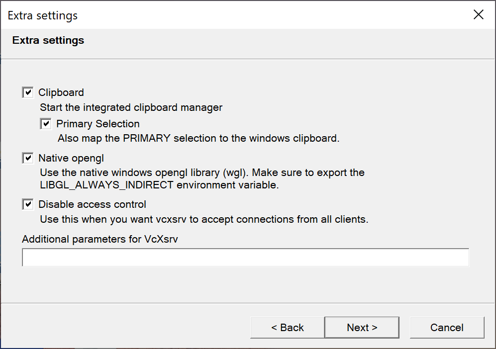 Tick Clipboard, Primary Selection, Native opengl, Disable access control (If you use