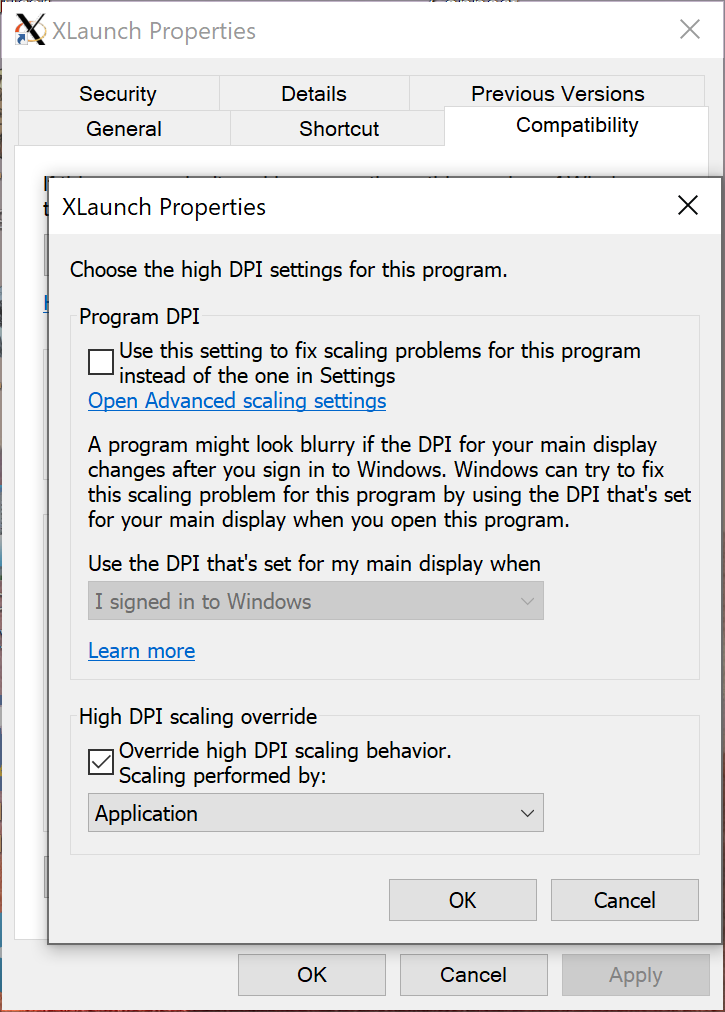 XLaunch(VcXsrv) -> Compatibility -> Change high DPI settings -> Tick Override high DPI scaling Behavior, Application.